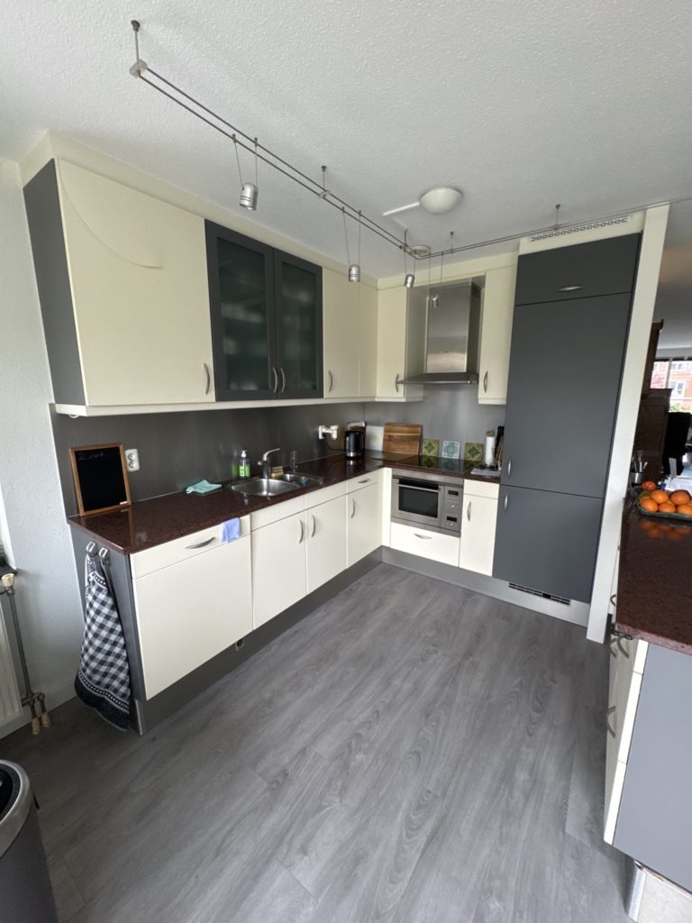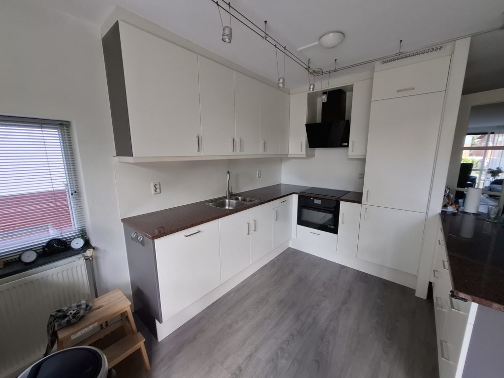 Nieuwe AEG oven met magnetron functie, AEG afzuigkap, AEG inductiekookplaat mat zwart, kraan en led verlichting, aluminium achterwand RAL 9010